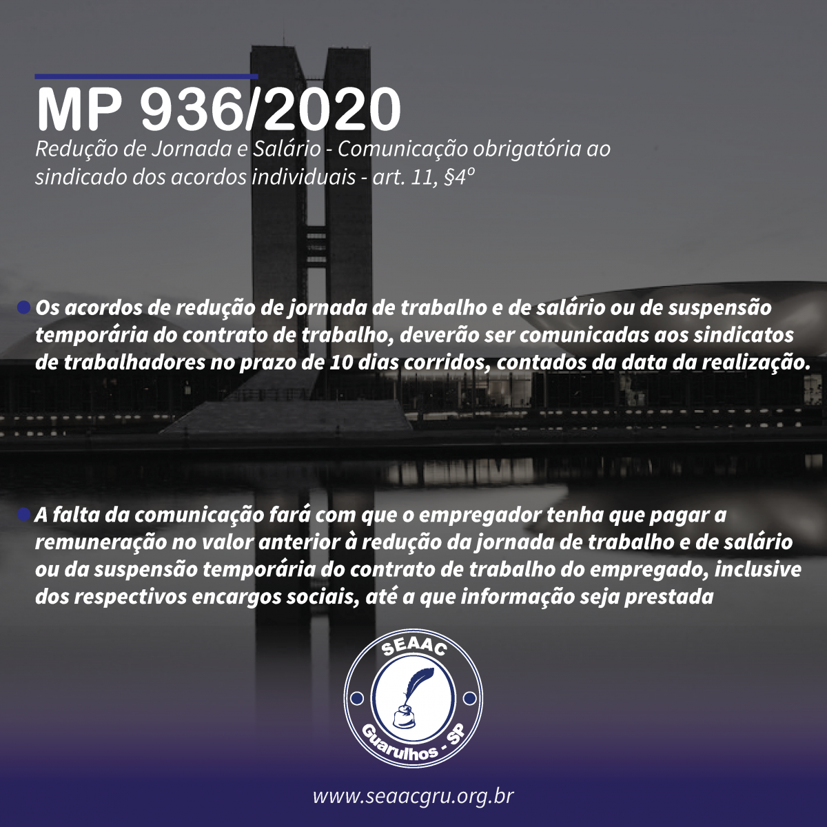 MP 936/2020 - ART. 11, § 4° A CONTAR DA DATA DA ASSINATURA, AS EMPRESAS TÊM 10 DIAS PARA ENVIAR AO SINDICATO OS ACORDOS INDIVIDUAIS DE REDUÇÃO DE JORNADA E SALÁRIO OU DE SUSPENSÃO DO CONTRATO DE TRABALHO!