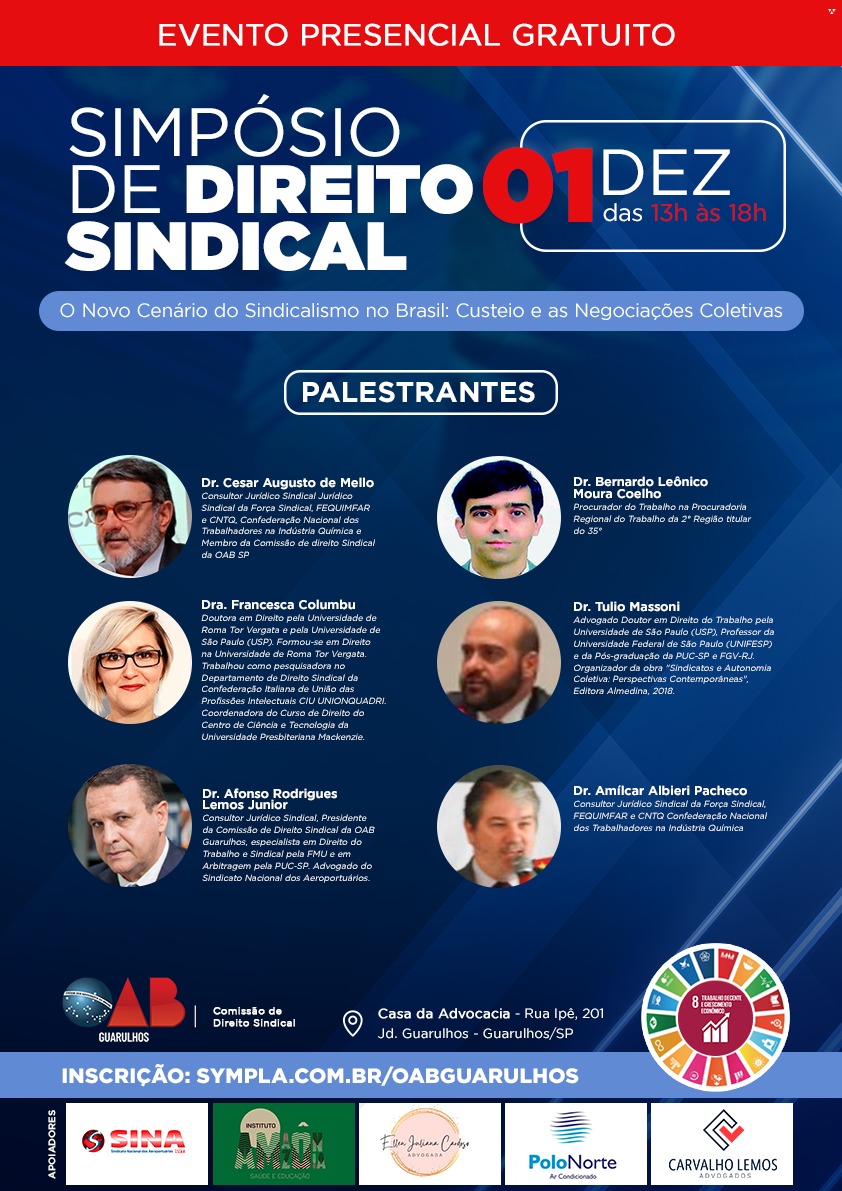 É com grande satisfação que compartilhamos nossa participação no Simpósio de Direito Sindical, realizado na sede da OAB 57 de Guarulhos. Agradecemos ao convite da Dra. Ellen Juliana, renomada especialista em Direito do Trabalho e Sindical, e do Dr. Afonso Rodrigues, Consultor Jurídico Sindical e Presidente da Comissão de Direito Sindical da OAB Guarulhos.