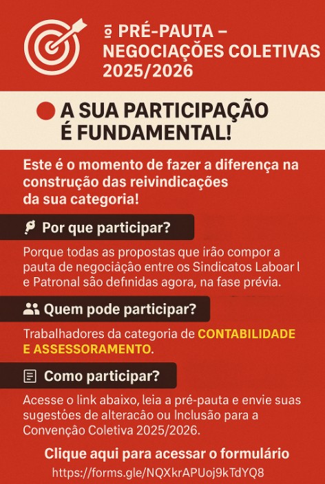 O processo acesse o link abaixo, consulte a pré-pauta e envie suas sugestões de alterações ou inclusões para a pauta de reivindicações da Convenção Coletiva 2025/2026.