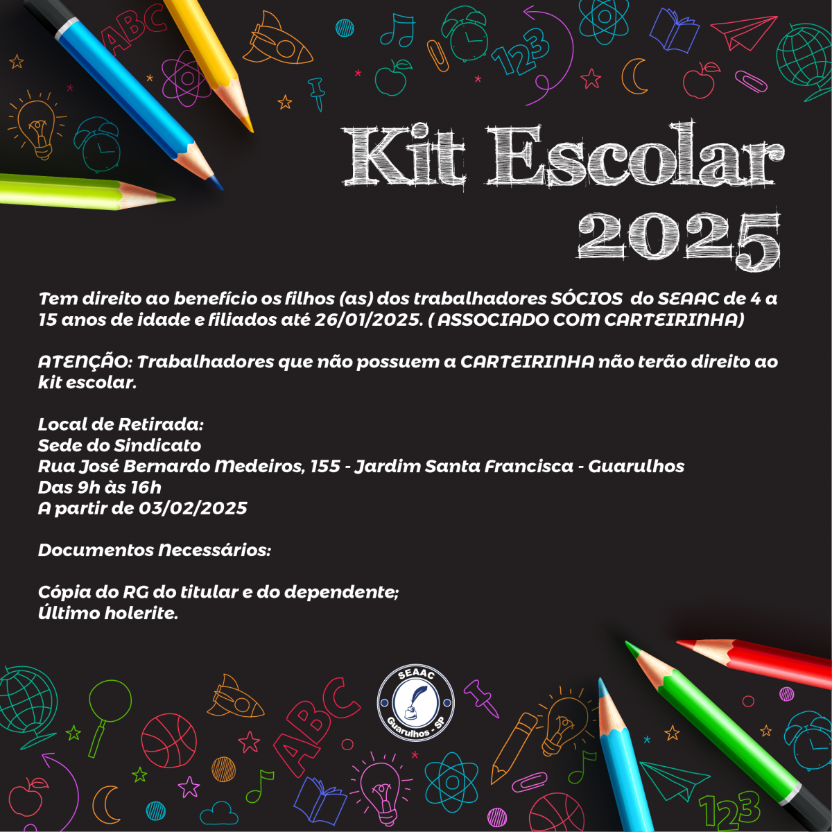 ATUALIZAÇÃO CADASTRAL - KIT ESCOLAR SEAAC 2024 - DIA 13/11/2023
